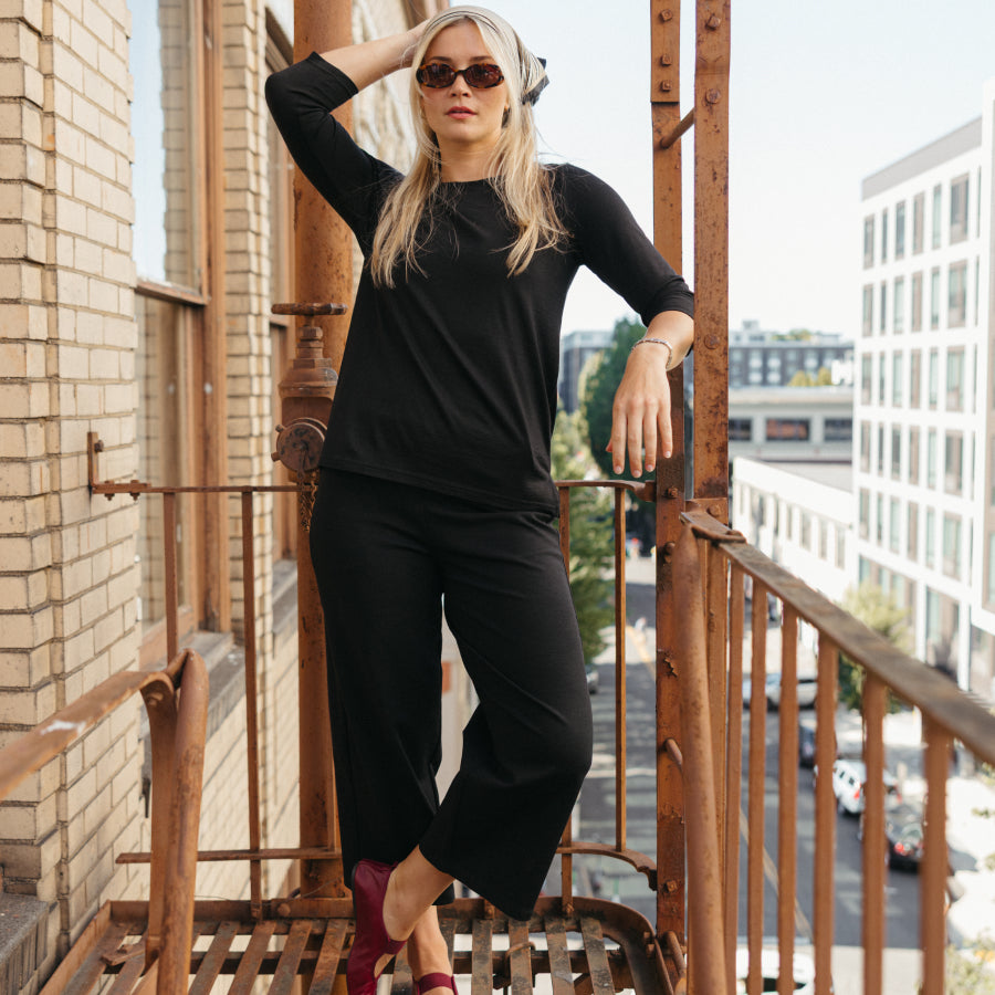 • Model wearing Colette Quarter-Sleeve Top in Black. Colette Quarter-Sleeve Top is a merino wool long sleeve, boatneck, regular fit top available in sizes XS-3X.