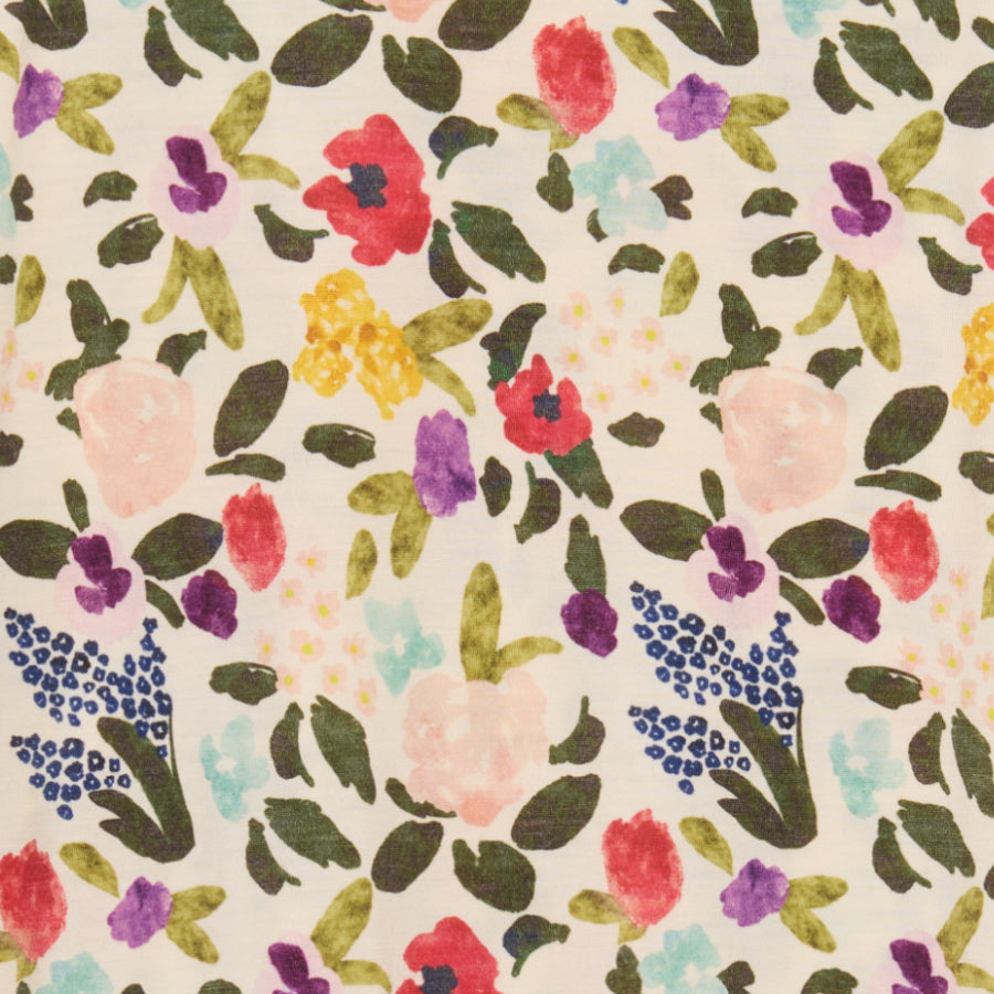 • Close-up view of Watercolor Floral Print - a multi-colored floral print on a cream background.